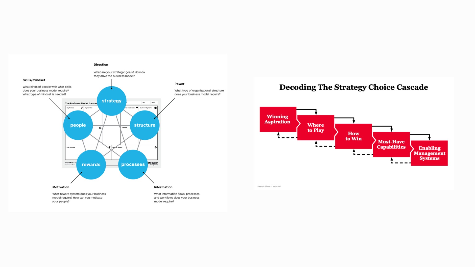 Ugyanakkor több jól működő megközelítés is létezik, amelyek különböző nézőpontból támogatják ugyanazt: a tudatos választást és a fókusz fenntartását. Az egyik ilyen hasznos keret Roger Martin Strategic Choice Cascade modellje, amely öt egymásra épülő kérdés mentén segíti a tiszta gondolkodást. Ezt kiegészítve Jay Galbraith STAR modelljével (Strategy–Structure–Processes–Rewards) és megoldásfókuszú kérdésekkel, egy nagyon jól használható, gyakorlati eszközt kapunk.