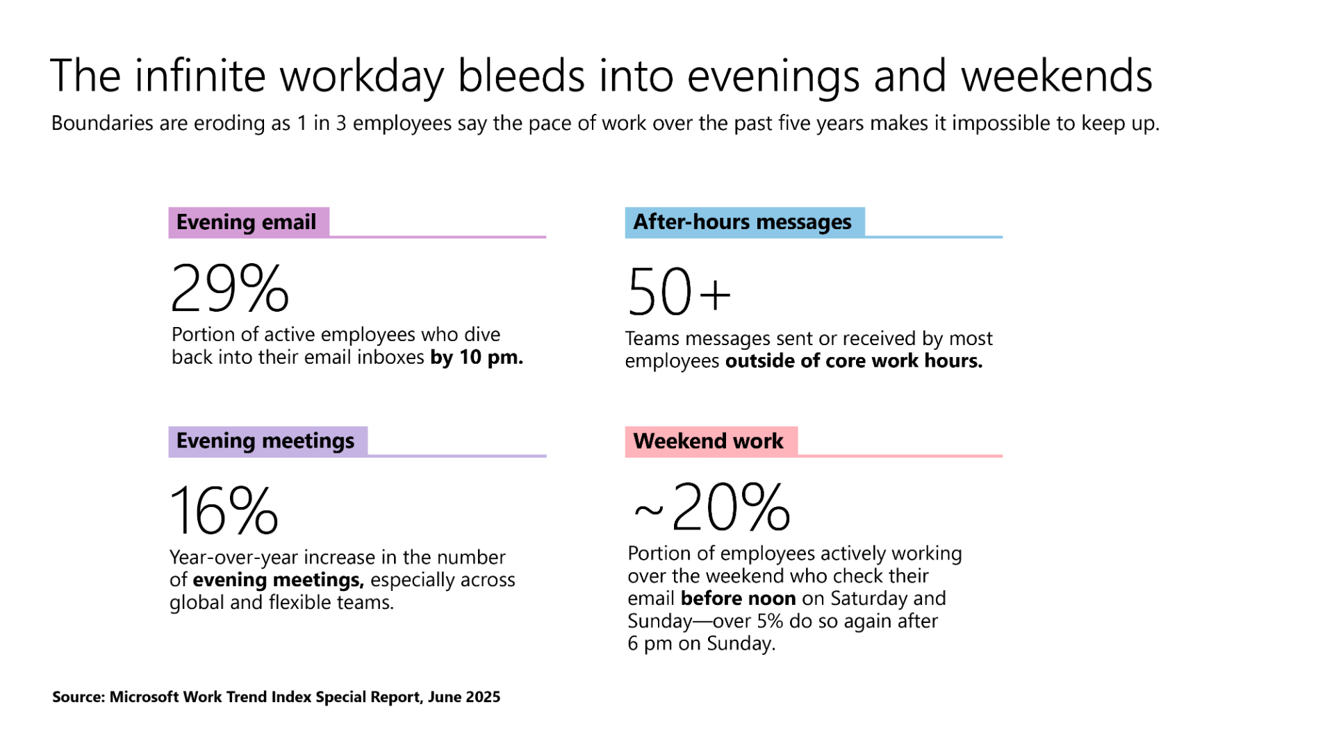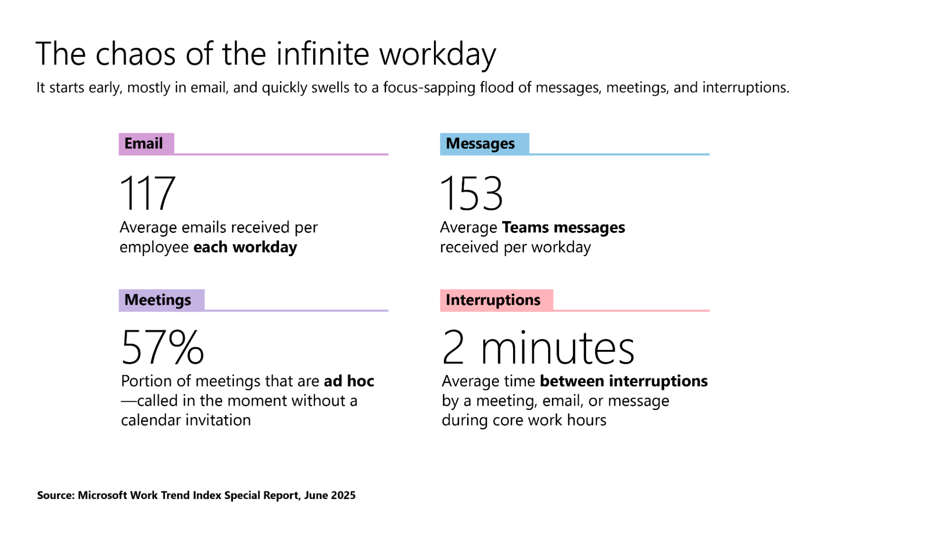 A Microsoft 2025-ös Work Trend Index jelentése — több milliárd anonimizált Microsoft 365-használati adat alapján — egy olyan munkavilágot mutat, ahol a megszakítás soha nem ér véget, és a valódi fókuszidő szinte teljesen eltűnt.